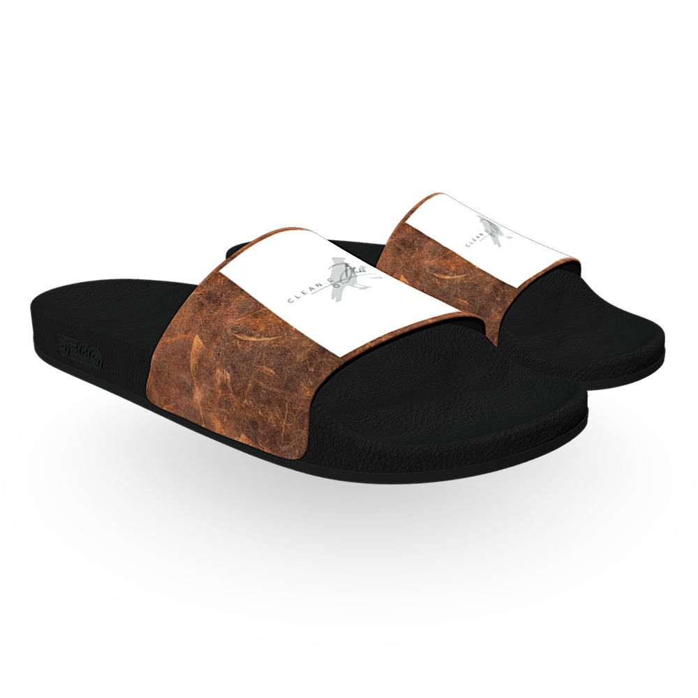 Our digital leather print imitation of leather + LOGO. Stressed leather and only in black solid flops/ bottoms.